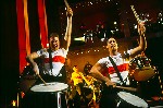 Blast consists of 35 members, drawn from the world of outdoor pageantry all across North America. There are over 40 world titles held by Blast cast members who comprise three performing sections, the brass, percussion, and visual ensembles. The brass instruments are pitching in the standard multi-keys. The percussions section includes drums, mallet instruments, and electronic keyboards. The visual element enhances the show by spinning and tossing unusual implements along with the traditional sabers and colorful flags in perfectly synchronized, ballet-like drill.
